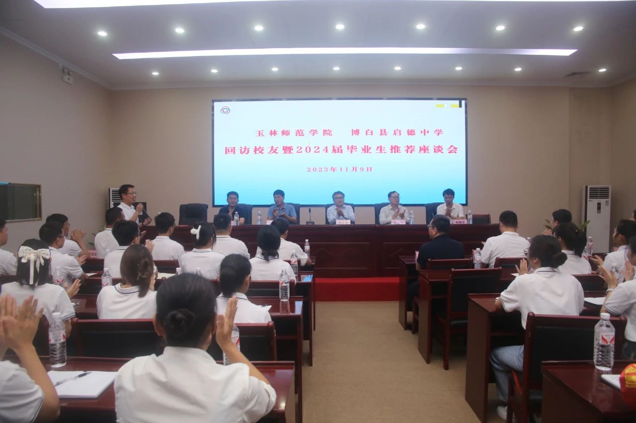 调研组在博白县启德中学回访校友并召开2024届毕业生推荐座谈会。启德中学校长介绍了该校基本情况,认为玉师校友是责任心强、业务能力强、执行力强,团结意识好的新时代四有好老师,希望双方能进一步加强互动交流,持续深化“校校”合作,共同助力教育教学高质量发展。在该校任职的我校校友进行了经验分享发言,感谢母校的培养,也期待更多校友到启德中学从教。刘永建对启德中学的办学特色和成绩给予了充分肯定,希望继续加强交流合作,共同促进两校发展。