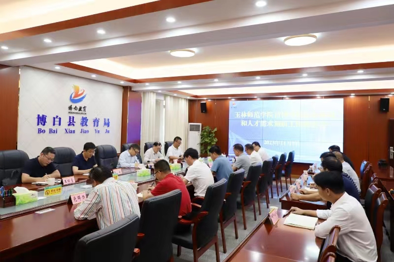 调研组在博白县教育局召开座谈会。刘永建介绍了我校的基本情况,详细分析了近几年招生(博白生源)和博白籍毕业生情况,并推荐了我校2024届(博白籍)毕业生,希望博白教育局和我校共同努力,达到博白籍毕业生“精准就业”效果,实现双赢。周金昌表示,希望加快开展校地共建,以高质量的人才引进,高质量的师资力量促进博白县教育事业和经济社会发展各项事业的高质量发展。