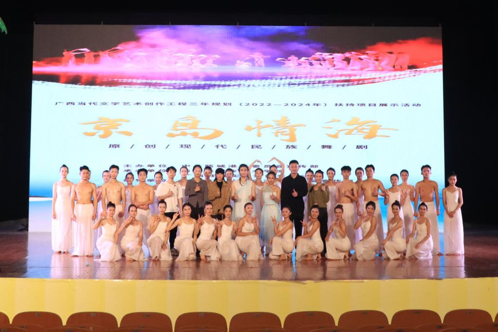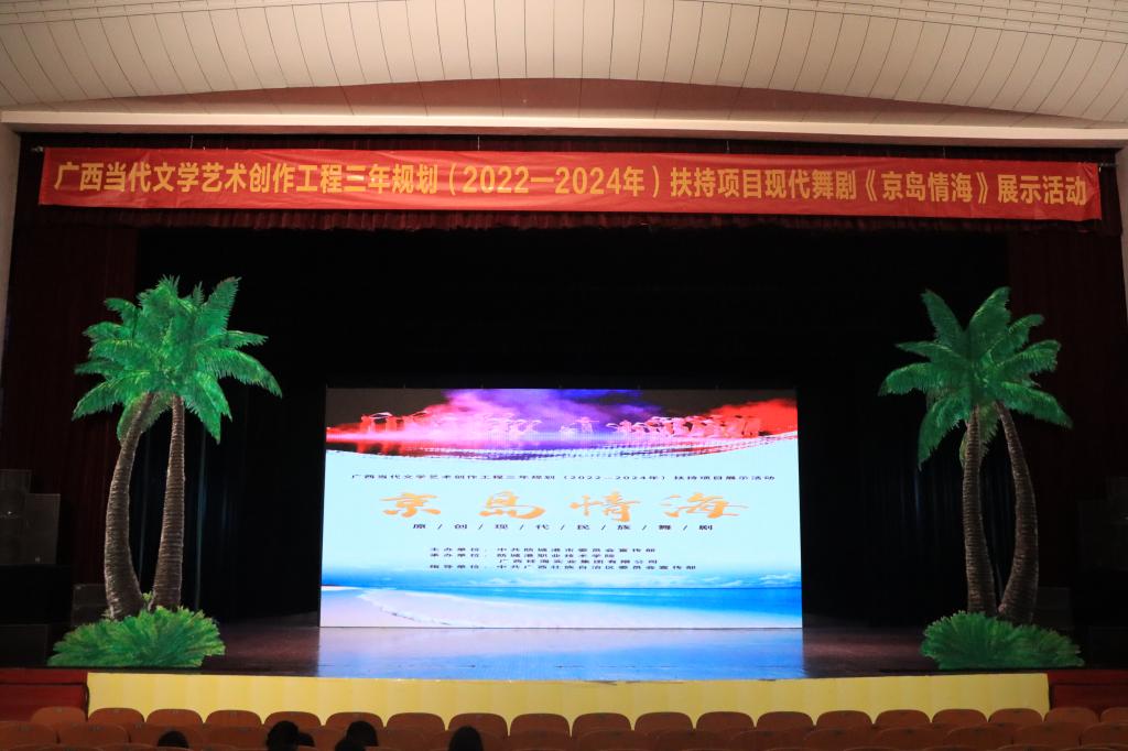 11月28日晚,广西当代文学艺术创作工程三年规划(2022—2024年)扶持剧目《京岛情海》在我校东校区演示厅巡演。我校师生代表近千人到场观看。