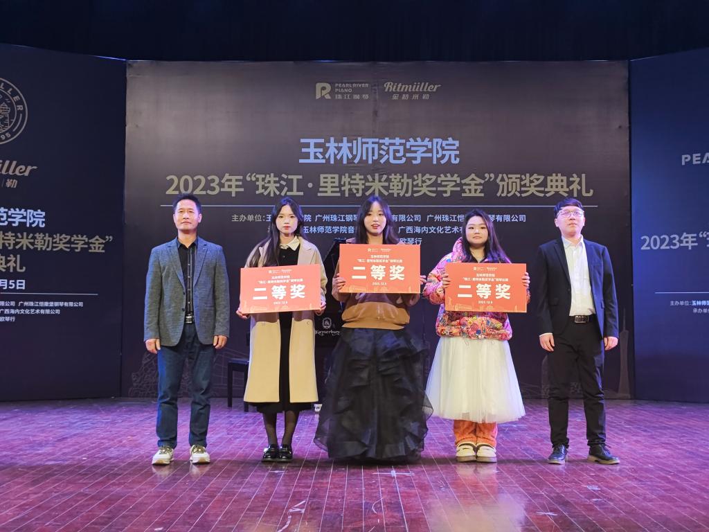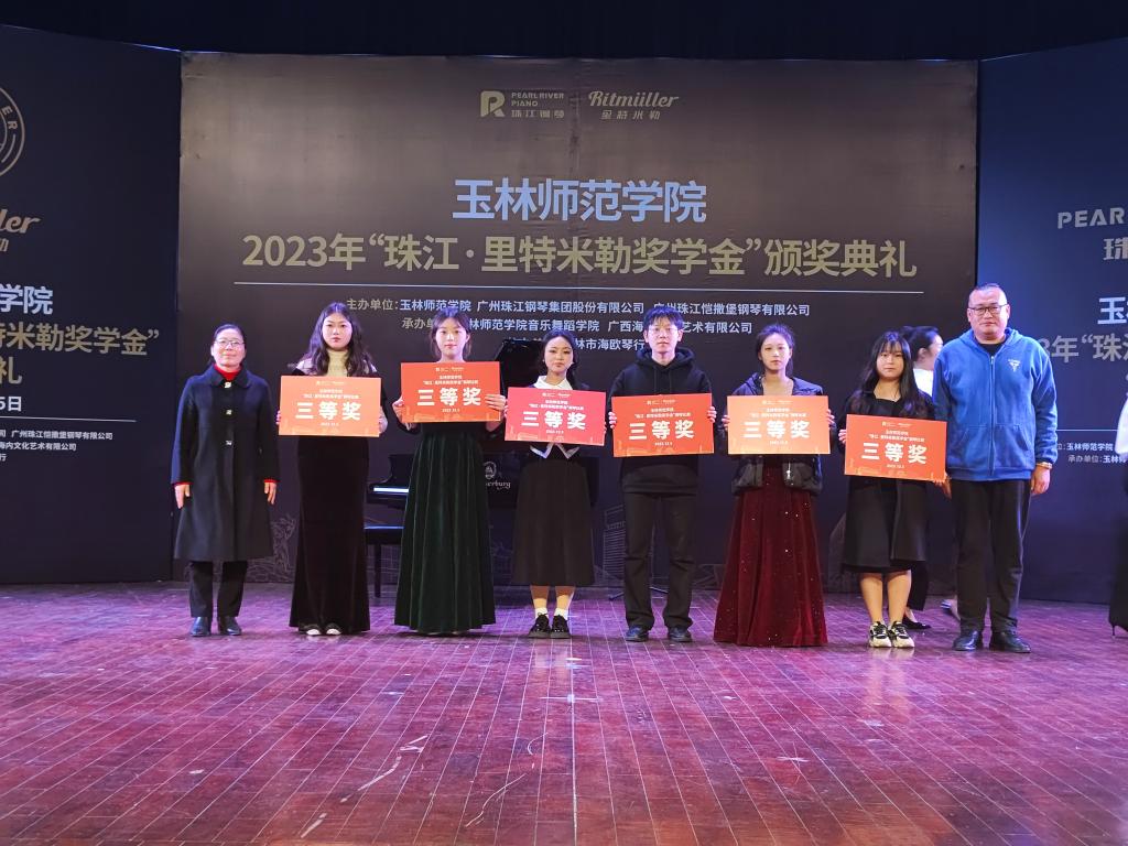 12月5日下午,学校在大学生活动中心演艺厅举行“珠江·里特米勒奖学金”颁奖典礼暨获奖学生钢琴音乐会。我校党委副书记韦广雄,广州珠江恺撒堡钢琴股份有限公司总经理助理胡武军、销售部业务经理李彤兴,广西海内文化艺术有限公司董事长黄恒内校友出席活动,校友办负责人和音乐舞蹈学院师生代表参加活动。
