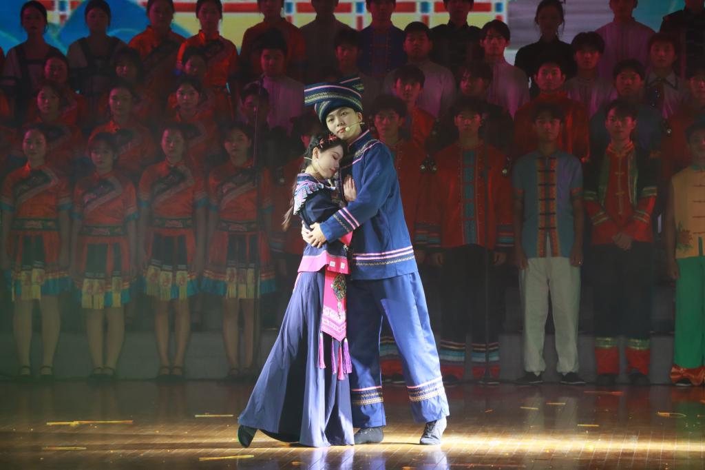 12月18日晚,我校东区演示厅灯火辉煌、热闹非凡,音乐舞蹈学院2021级大型采风剧目《悠悠雨桥情》在此上演。学校副校长黄映然、刘永建,党委常委、宣传部部长徐一周出席演出,我校师生代表以及校外各界人士近千人到场观看。