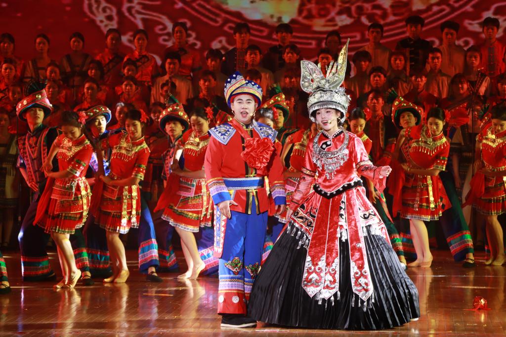 《悠悠雨桥情》全剧由序幕、四场分幕和尾声六个部分组成,是一场将耶歌文化、笙舞文化、农耕文化、婚俗文化等文化元素融为一体、精心制作的歌舞剧。剧目在丰收的田野吹来阵阵稻穗香的歌舞表演中拉开序幕,男女主的相遇如鹿归林、如舟靠岸。他们在“幸得识卿桃花面,从此阡陌多暖春”中相知。“看!河边戏水的那个女孩是你的恋人吗?”“你莫走,只愿君心似我心,定不负相思意……”此时,男女主爱意随风起,相知亦相恋。一股悸动,一个眼神,一个触碰,一支舞,凝视一个人的双眼,点亮一整片天空。剧目将男女主的相爱情境演绎的酣畅淋漓,最后在“谨以白头之约,书向鸿笺;好将红叶之盟,载明鸳谱”的大婚中落下帷幕。
