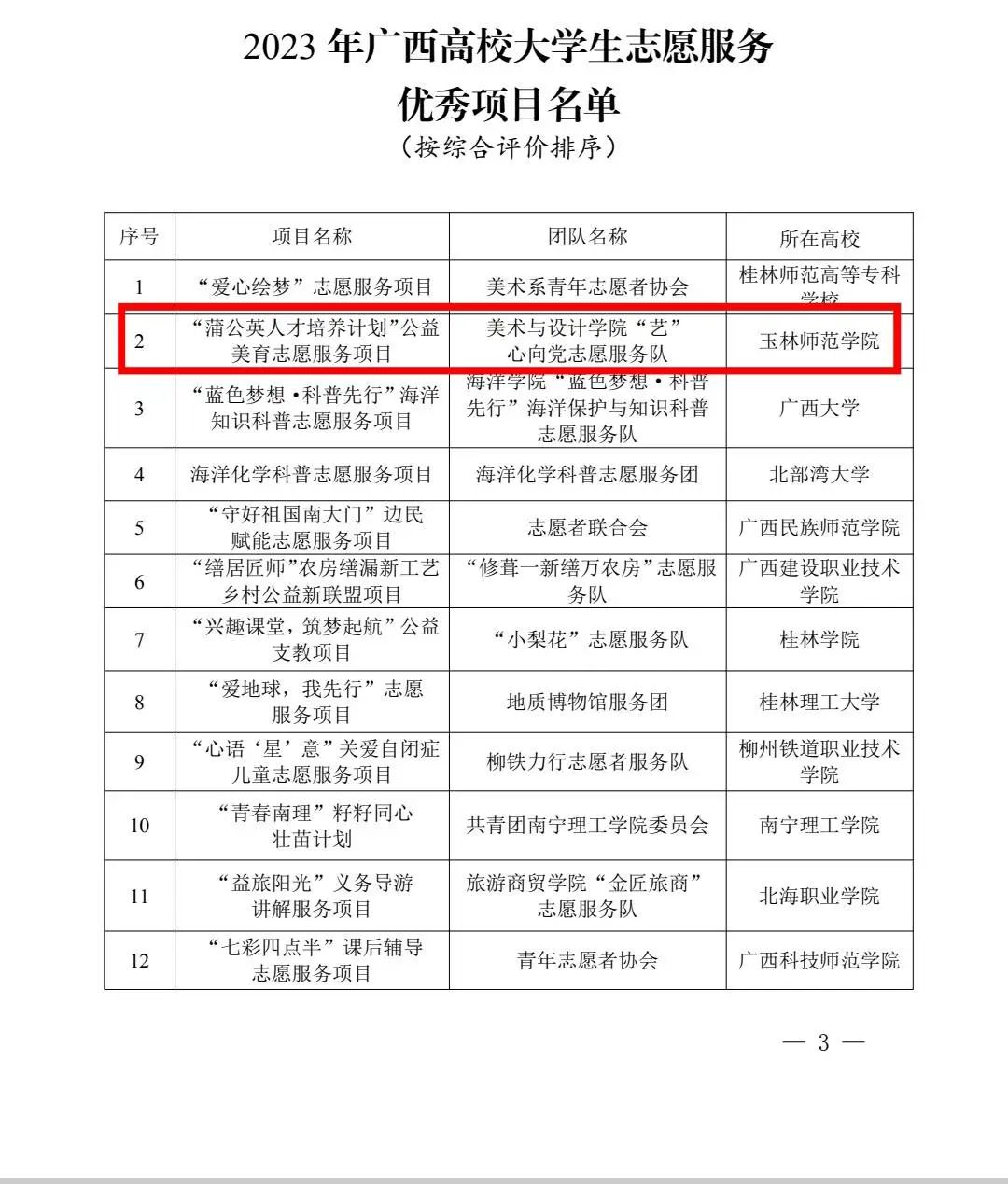 为深入学习宣传贯彻习近平新时代中国特色社会主义思想和党的二十大精神,全面贯彻落实习近平总书记关于志愿服务工作的重要指示要求,持续打造我区高校大学生志愿服务品牌,自治区党委教育工委面向全区高校征集了大学生志愿服务优秀项目。经各高校申报、专家评审,玉林师范学院“蒲公英人才培养计划”公益美育志愿服务项目等30个项目入选2023年广西高校大学生志愿服务优秀项目。