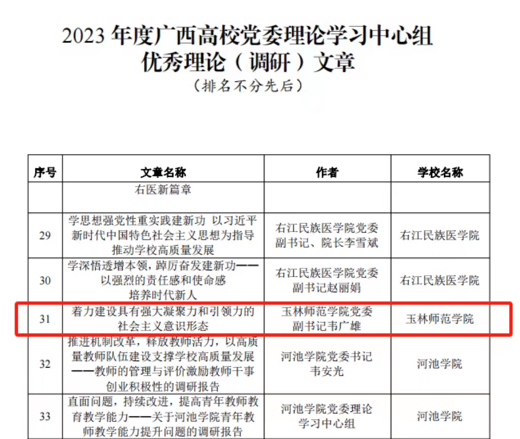 近日,根据《自治区党委教育工委办公室关于公布2023年度广西高校党委理论学习中心组优秀学习品牌和优秀理论(调研)文章的通知》(桂教工委办〔2023〕185号),我校党委理论学习中心组“五学五度”学习示范品牌获评为2023 年度广西高校党委理论学习中心组优秀学习品牌,学校党委副书记韦广雄的文章《着力建设具有强大凝聚力和引领力的社会主义意识形态》入选 2023 年度广西高校党委理论学习中心组优秀理论(调研)文章。
