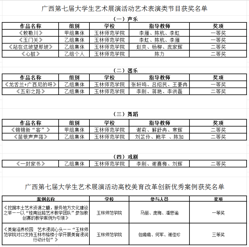 近期,广西第七届大学生艺术展演活动评选结果公布,音乐舞蹈学院师生斩获佳绩,其中艺术表演类节目,声乐获一等奖2个、二等奖2个,器乐获一等奖1个、二等奖1个,舞蹈获二等奖2个,戏剧获二等奖1个;高校美育改革创新优秀案例获一等奖1个、三等奖1个。