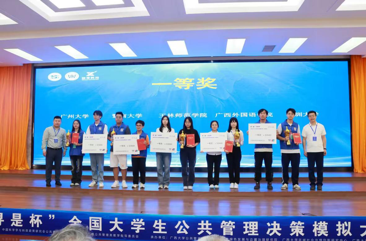 4月27日至28日,由中国科学学与科技政策研究会主办,广西大学公共管理学院承办,上海哲寻信息科技有限公司提供技术支持的第三届“寻是杯”全国大学生公共管理决策模拟大赛(华南地区)在广西大学成功举办,我校政法学院行政管理专业学生潘广林、黄辉俊、甘丽斌三位学生在行政管理专业负责人贾丹、行政管理教研室主任何映桥带队指导下参加比赛,并荣获华南赛区一等奖。