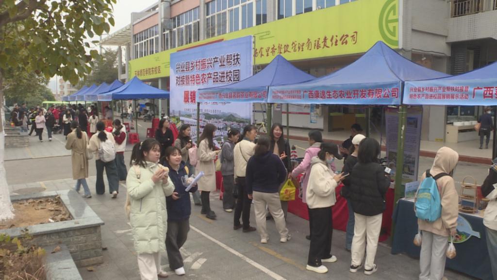 教师 张琼元:兴业县和玉林师范学院开展这个特色农产品进校园的一个展销活动,这个活动也是在我们学校第一次举行,意义非凡。首先的话,能够助力乡村振兴,其次的话,就是能够更方便我们师生了解我们当地的这个特色农产品,同时现场的话也设立了邮政的这个寄送的一个服务,更方便我们师生进行这个产品的一个选购,并且能够包邮寄送回家,这是一个非常好的活动。