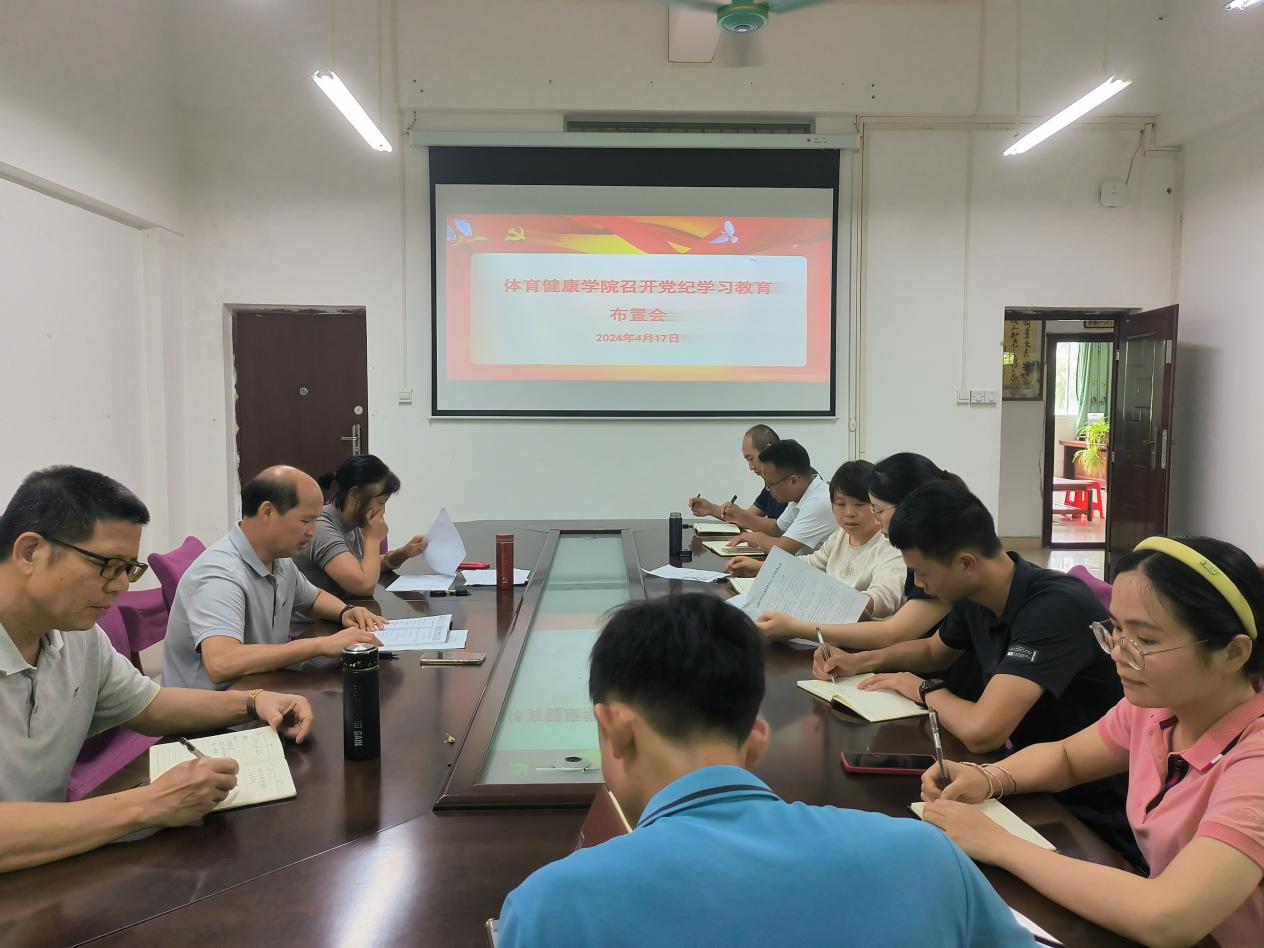 4月17日,体育健康学院于玉林师范学院东校区厚德楼1-206会议室召开党纪学习教育布置会,学习贯彻习近平总书记关于党纪学习教育的重要讲话和重要指示精神,传达学校党纪学习教育启动部署会精神,组织学习《中共玉林师范学院委员会关于开展党纪学习教育的实施方案》,贯彻落实党纪学习教育工作。本次会议由该院党委书记周必宁主持,该院全体领导班子成员及各党支部书记参加。