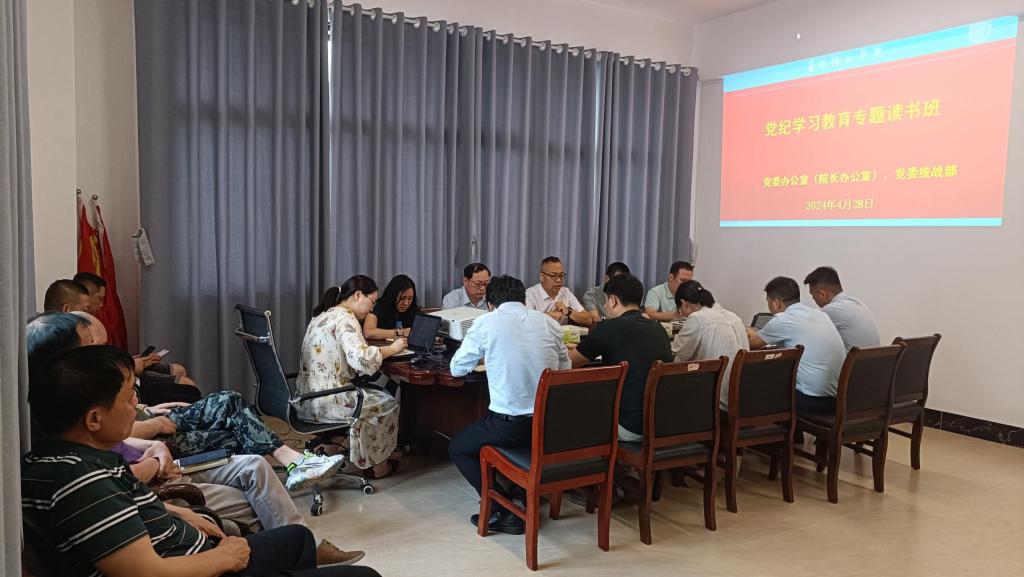 4月28日下午,党委办公室(院长办公室)、党委统战部在新民楼A525举办党纪学习教育专题读书班,支部书记高茂兵主持学习,党委办公室(院长办公室)、党委统战部全体成员参加会议。