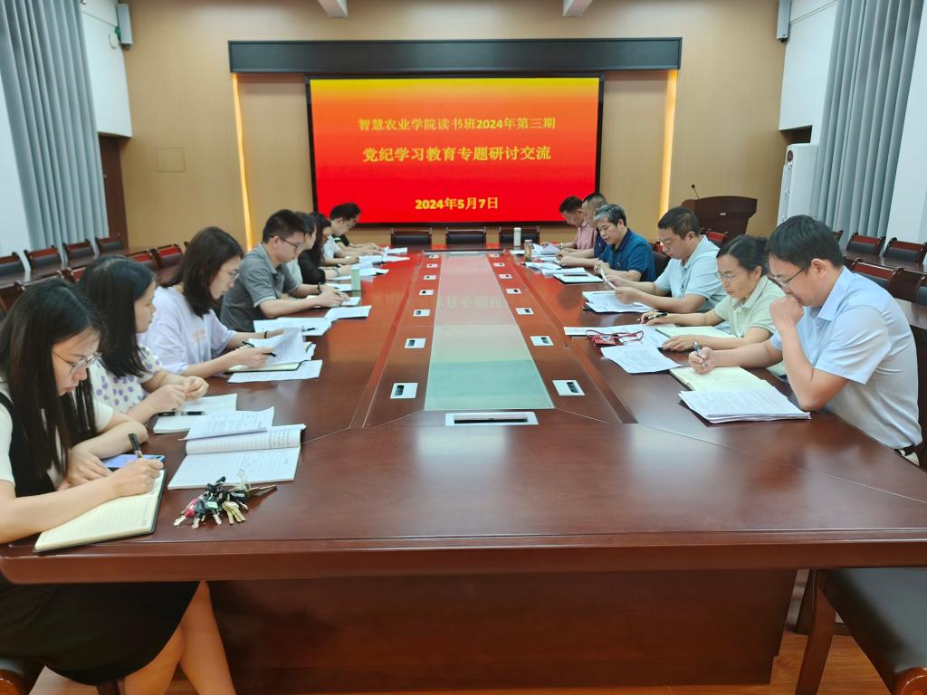 5月7日,智慧农业学院于学院304会议室举行2024年第三期读书班,召开党纪学习教育专题研讨交流会。该院领导班子成员,科级及以上干部,各党支部书记、副书记,辅导员参加研讨交流。