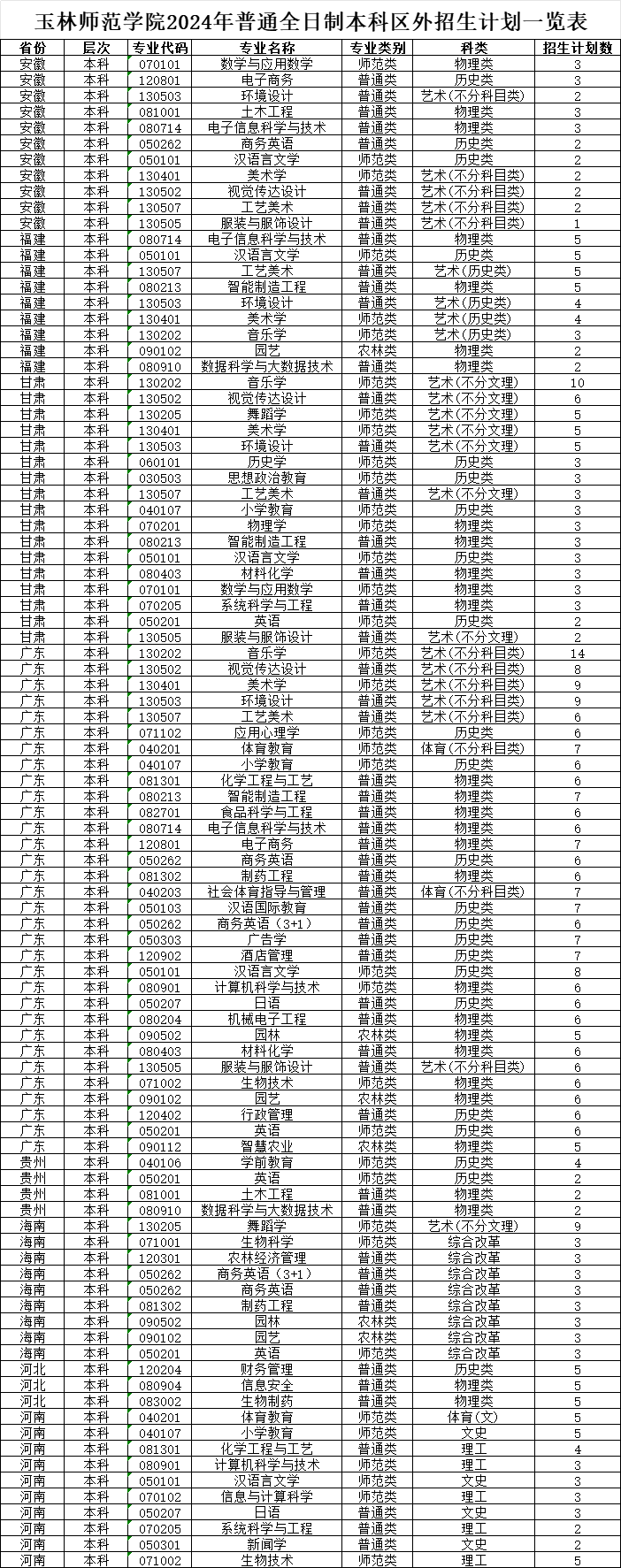 玉林师范学院2024年全日制普通本科区内招生计划一览表
